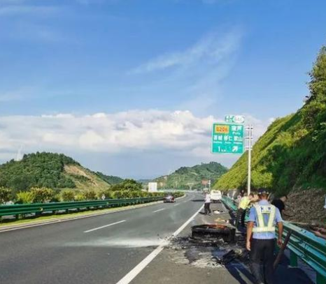 司機(jī)譚某通過(guò)后視鏡發(fā)現(xiàn)后車廂貨物著火后,驚出一身汗,急忙把車停到應(yīng)急車道上,為防止車子也被燒著,連忙和隨乘人員將著火的貨物往應(yīng)急車道上搬,因?yàn)檐嚿蠜](méi)攜帶滅火器,只能用椎筒裝隔離欄外水坑的水滅火,并報(bào)警求助。