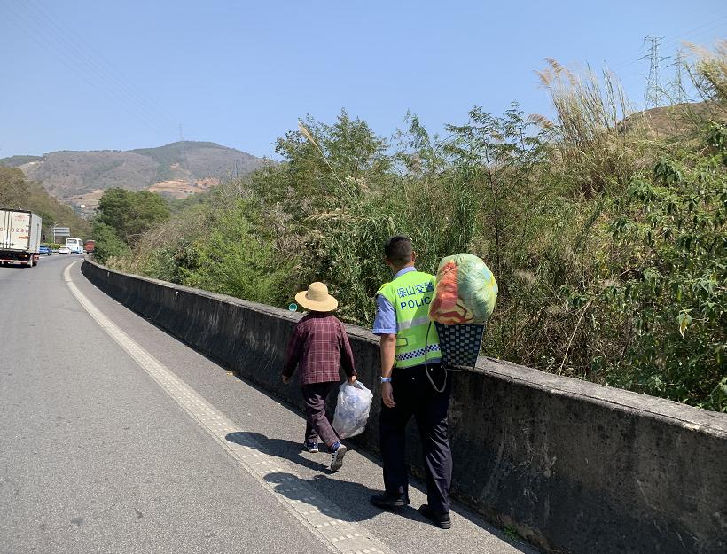 2022年3月13日下午2點15分,云南保山市公安局交警支隊保龍二大隊巡邏警組巡邏至保龍高速公路德宏往保山方向2764公里400米處時,突然發(fā)現(xiàn)一位老人背著背簍,在高速公路硬路肩上逆向走著,路過的車輛紛紛緊急避讓,十分危險。發(fā)現(xiàn)這一情況后,執(zhí)勤民警立即下車查看。