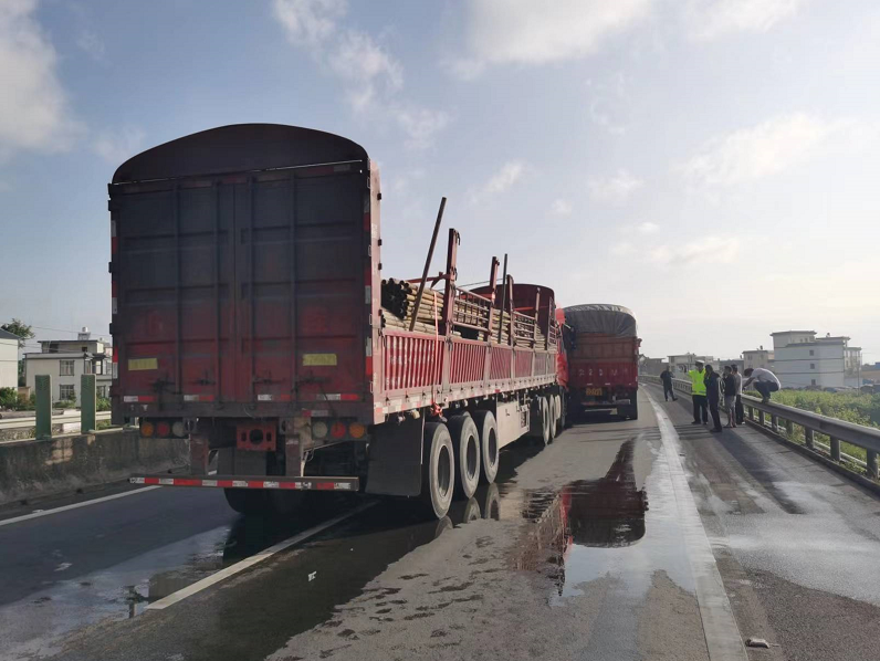 接到報(bào)警后民警迅速趕到現(xiàn)場,只見道路上有兩輛重型半掛牽引車停在路面上,后方車輛車頭右前側(cè)緊緊貼著前車尾部,民警立即對現(xiàn)場進(jìn)行勘察和維護(hù),最短時(shí)間內(nèi)恢復(fù)了道路的通行。