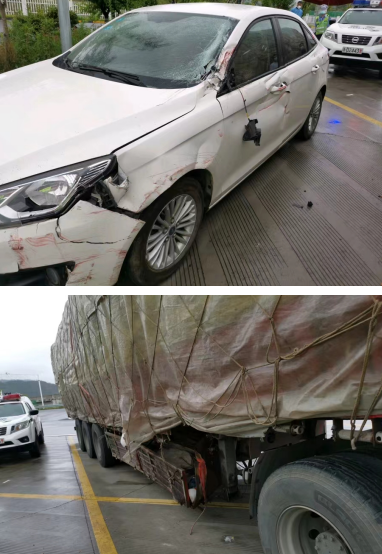 5月23日下午3點(diǎn)多,杭紹臺高速上發(fā)生一起驚險(xiǎn)的事故,一輛白色小車在高速行駛過程中,車輛突然從快車道變更到慢車道上,眼看馬上就要碰到前方貨車了,又變道到硬路肩上,車輛左右多次晃動后,小車左側(cè)碰撞貨車右側(cè)中部,又往右偏到右側(cè)護(hù)欄,最終停在硬路肩上。