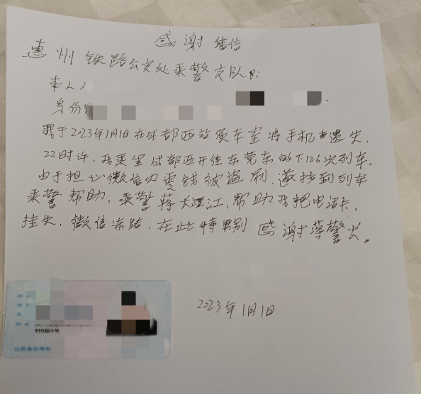 乘警隨即開展工作,經(jīng)了解得知代先生此趟出行是前往東莞打工,銀行賬戶上的錢是他一年的打工積蓄。乘警意識到,如若被別有用心的人拿到手機(jī),確實(shí)存在被盜刷的隱患,便立即在車上指導(dǎo)其掛失手機(jī)卡和凍結(jié)銀行賬戶,免除其后顧之憂。代先生通過登錄賬戶,看到里面金額分毫不差后,激動不已,緊緊握住乘警的手說到:“十分感謝您警官,要是沒有你的幫助,我的積蓄可能就被盜刷了。”隨即寫下感謝信一封,表達(dá)對乘警工作的感謝。