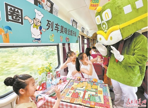 7月15日,杭州客運(yùn)段在K210次列車(chē)上開(kāi)展主題餐廳新品發(fā)布活動(dòng),推出升級(jí)版兒童套餐,并舉辦“跟著安安坐火車(chē)”課堂,讓嘴巴嘗到美食、腦袋裝進(jìn)知識(shí)。圖為小朋友與憨態(tài)可掬的人偶“安安”互動(dòng)。周?chē)?攝