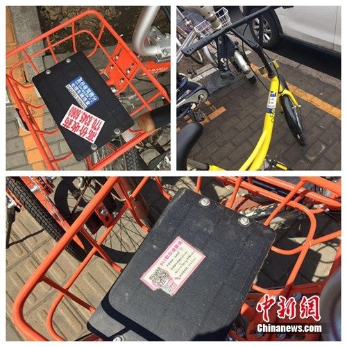 多個共享單車品牌車輛遭小廣告侵襲。中新網(wǎng)吳濤 攝