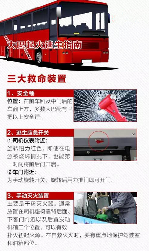 雖然事故原因尚在調(diào)查,但危急時(shí)刻,學(xué)習(xí)如何逃生自救也很關(guān)鍵。大巴車安全裝置設(shè)在哪兒?如何使用?除了車門,還有哪里是逃生出口?燒傷、骨折,送醫(yī)前該怎么處理?