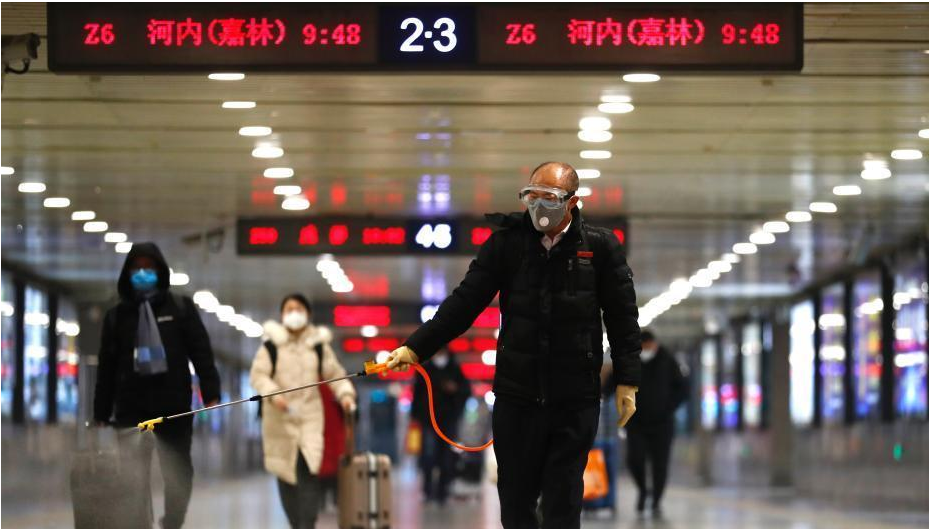 2月2日,北京西站工作人員佩戴口罩、護目鏡上崗工作。近日,為進一步做好新型冠狀病毒感染的肺炎疫情防控工作,北京西站對進、出站旅客測溫,并加強站內消毒。