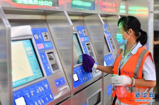 8月2日,在長沙地鐵馬廠站,工作人員對售票機進行清潔消毒。