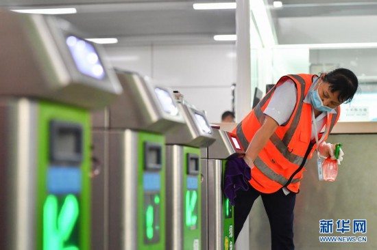 8月2日,在長沙地鐵馬廠站,工作人員對閘機進行清潔消毒。