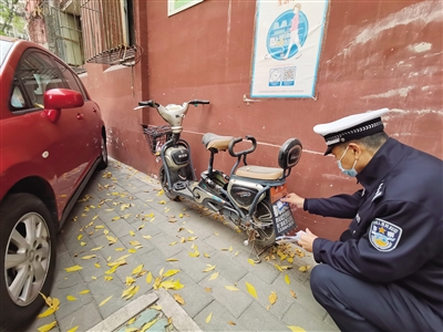 昨日,豐臺(tái)交警在小區(qū)內(nèi)給超標(biāo)電動(dòng)自行車(chē)張貼“提示單”。新京報(bào)記者 裴劍飛 攝