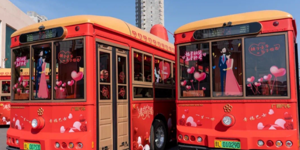 “520”(諧音:我愛你)主題公交著力打造“愛情公交”,投放在市區(qū)15路公交線路中,總計(jì)18輛,車身整體為粉紅色,車廂內(nèi)也是浪漫滿分,隨處可見“愛的表白”“暖心話語”等,更傳遞著年輕化、時(shí)尚化。