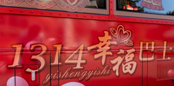 其中“1314”(諧音:一生一世)主題公交著力打造“幸福專線”,投放在市區(qū)23路公交線路中,總計(jì)13輛,車身整體為大紅色,車廂內(nèi)的喜慶感也全線拉滿,大紅色的紗簾、喜慶的裝飾以及多個(gè)年代的結(jié)婚證與婚禮習(xí)俗文化照片陳列其中,“土味情話”更是讓人直呼幸福感滿滿。