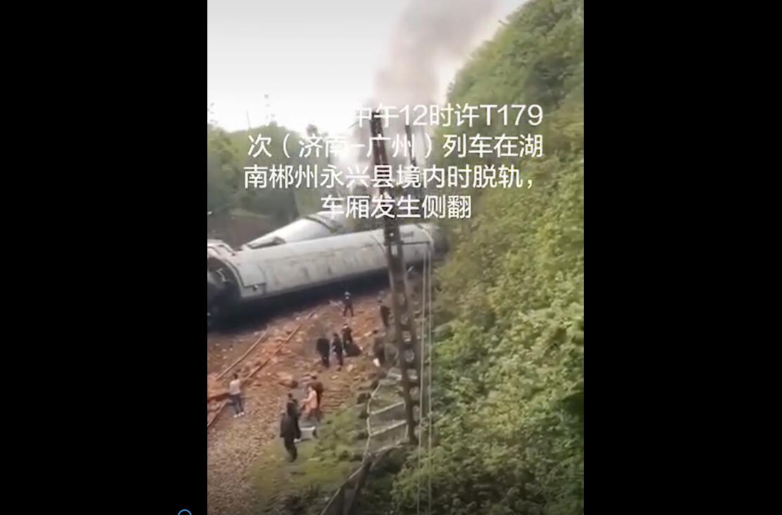 3月30日中午12時許,T179次(濟南-廣州)列車運行至湖南郴州永興縣高崗司鎮(zhèn)境內發(fā)生側翻,有車廂側翻,導致機后第一節(jié)發(fā)電車起火,第二至六節(jié)車廂脫線傾覆。鐵路部門第一時間啟動應急預案,和地方消防官兵積極展開搶險救援行動。經(jīng)第一輪搜救,起火車頭內無人員被困,側翻車廂所有被困人員已安全撤離,受傷人員由政府統(tǒng)一安置。 經(jīng)第二輪搜救后,一名乘務員被卡在13-14節(jié)擠壓車廂中間,2名送往醫(yī)院的重傷人員無生命危險,情況穩(wěn)定。 目前,明火已基本被撲滅,正在組織第三輪搜救。