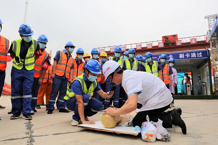 6月19日,武漢地鐵集團(tuán)在由中鐵十一局承建的武漢地鐵16號線川沌區(qū)間現(xiàn)場開展了防洪搶險(xiǎn)應(yīng)急演練。圖為醫(yī)生在現(xiàn)場進(jìn)行心肺復(fù)蘇急救培訓(xùn)。(攝影/唐里)