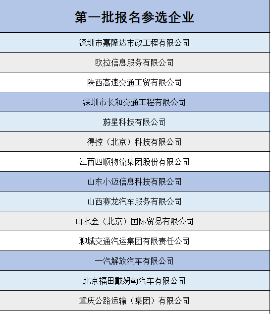 根據(jù)《2020交通運輸新業(yè)態(tài)100強評選通知》,本組委會按照嚴格評選條件和相關(guān)組織評選,本著公開公正的原則,將第一批報名參選企業(yè)名單進行公示(部分企業(yè)),如有異議,請向《人民交通》雜志社組委會反應(yīng)。公示名單如下: