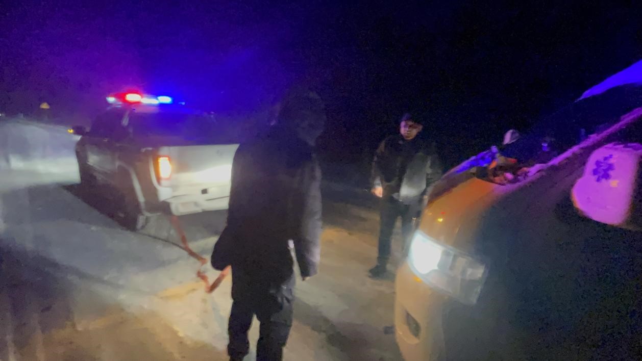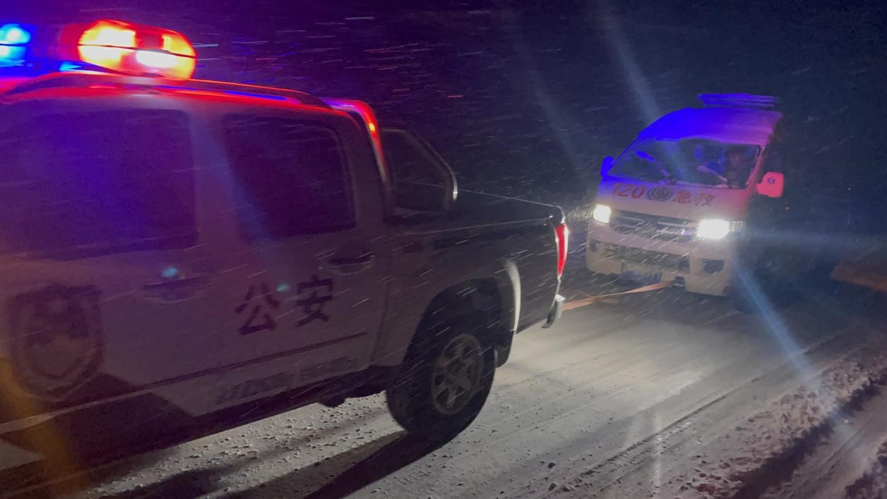 10月10日晚20時(shí)43分,新疆加克拉克邊境派出所接110指令:“轄區(qū)白沙湖旁的314國道1632路段至1654路段有車輛在上行的路上被困于暴雪中,請(qǐng)求救援”。派出所接到報(bào)警后,立即指派離事故地較近的執(zhí)勤卡點(diǎn)民警出警,執(zhí)勤卡點(diǎn)兩名民警接到指令后,迅速帶領(lǐng)三名輔警趕往事故發(fā)生現(xiàn)場。到達(dá)現(xiàn)場后發(fā)現(xiàn),幾十余臺(tái)車輛被堵在道路上,此時(shí)狂風(fēng)裹扶著暴雪已經(jīng)下了10余個(gè)小時(shí),路面積雪已沒過腳踝,出警民輔警們克服極端天氣和高海拔帶來的影響,迅速找到被困的黑色小轎車,民警王東明見狀,立即從警車上取車拖車?yán)K系在被困車輛上,企圖用警車把被困車輛脫出,但路面已積有暗冰,警車打滑嚴(yán)重,出警民警馬浩看此情形,立馬招呼輔警一同上前助推車輛,在一遍遍口號(hào)中、一次次發(fā)力里,歷經(jīng)一個(gè)多小時(shí)才將被困車輛拖出雪窩。