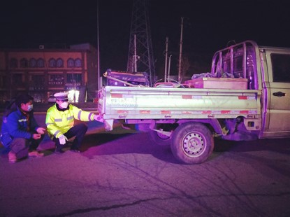 “多防一步,不出事故!上路行駛滅火器、三角架記得隨車(chē)攜帶”在胡地亞于孜開(kāi)展夜間勤務(wù)的阿爾曼·阿補(bǔ)都賽力木溫和的向一輛未攜帶滅火器三角架的駕駛員說(shuō)道。