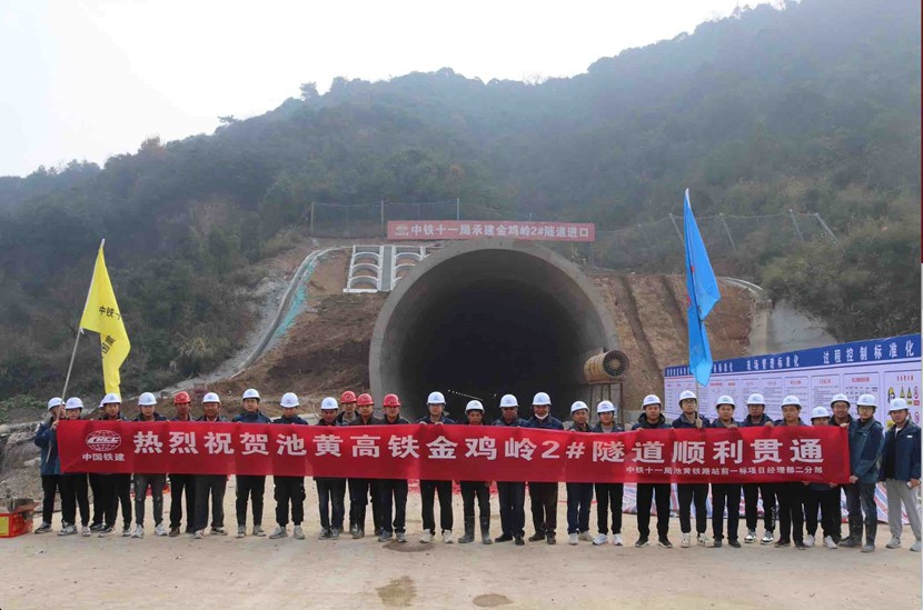 12月8日8點58分,中鐵十一局池黃鐵路站前一標金雞嶺2號隧道順利貫通,作為全標段首個全面貫通隧道,標志著本標段隧道施工取得重大突破,為下一步架梁鋪軌任務(wù)奠定基礎(chǔ)。