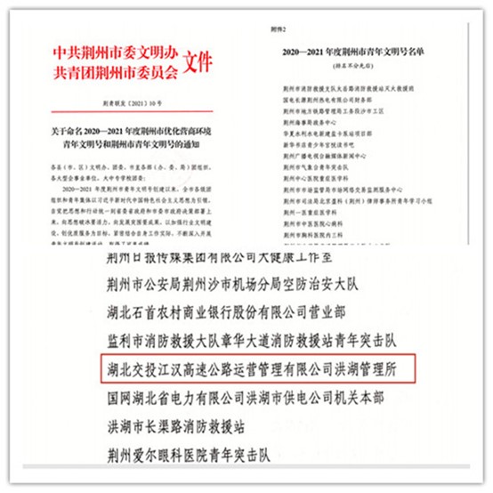 12月14日,共青團(tuán)荊州市委員會(huì)、荊州市文明辦下發(fā)《關(guān)于命名2020—2021年度荊州市優(yōu)化營(yíng)商環(huán)境青年文明號(hào)和荊州市青年文明號(hào)的通知》,湖北交投江漢高速公路運(yùn)營(yíng)管理有限公司洪湖管理所榮獲“2020—2021”年度荊州市“青年文明號(hào)”榮譽(yù)稱號(hào)。