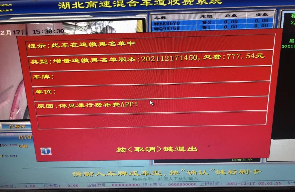 21日下午15點20分,一輛車牌為“豫B10***”的六軸貨車駛?cè)虢ǘ鞲咚侔讞钇菏召M站入口車道,原本應(yīng)該自動感應(yīng)的“ETC”毫無反應(yīng)。此時收費界面彈出黑名單提示框,當(dāng)班收費員立即上報監(jiān)控室,值班人員通過后臺數(shù)據(jù)篩查,發(fā)現(xiàn)該車被列入“黑名單”,且產(chǎn)生欠費777.54元,收費員告知司機這一情況后,司機一臉疑惑道“我沒逃費呀”,收費員隨即向司機介紹了高速公路通行“黑名單”的相關(guān)政策及形成原因。