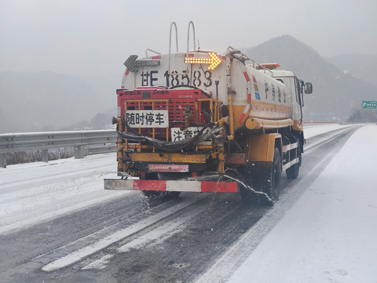 高速公路養(yǎng)護(hù)所按照“雪情就是命令”的工作要求,第一時間啟動防滑保暢應(yīng)急預(yù)案,吹響除雪保暢“沖鋒號”,組織應(yīng)急保暢人員、融雪劑灑布車、多功能除雪車,兵分多路開展除雪保暢作業(yè)。采取“機械除雪為主”的作業(yè)方式,出動大型融雪劑撒布車撒布環(huán)保型融雪劑,灑水車撒布有機液體融雪劑,并在急彎陡坡、特大橋梁、隧道口進(jìn)行人工撒鋪防滑料,重點對背陰路段、高海拔路段、易發(fā)生事故路段多頻次除雪。同時,與高速交警、收費、清障救援等部門聯(lián)勤聯(lián)動,保障信息暢通,值班人員24小時堅守在一線,密切關(guān)注天氣,及時采集、上報路況信息。