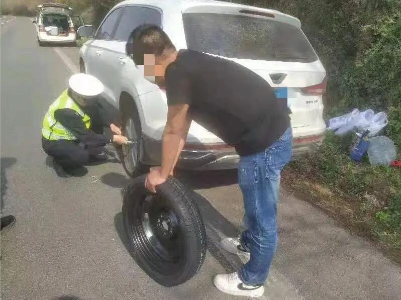 經(jīng)查,楊師傅當(dāng)天駕車從龍陵出發(fā)準(zhǔn)備前往昆明,剛行駛至此路段,車輛輪胎因為壓到了釘子導(dǎo)致車輛爆胎,車輛無法行駛,然而楊師傅卻不知道怎樣更換輪胎,正在他一籌莫展之時,保龍一大隊巡邏交警及時出現(xiàn),熟練地幫助駕駛?cè)烁鼡Q車胎。