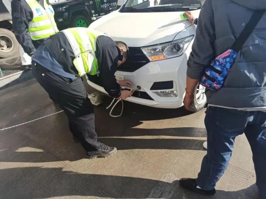了解情況后,民警連忙安慰張師傅:“師傅你別急,我們來幫助你......”民警立即安排組員在后方進(jìn)行安全警示,并從警車上拿來鋼繩,一頭固定在警車上,另一頭牢牢拴在面包車上,將車輛拖至服務(wù)區(qū)。張師傅將車輛加滿油后,拉著民警的手不斷地說著感謝。