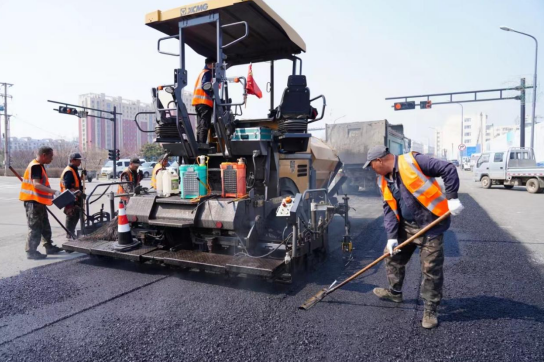 圖為:吉林舒蘭市人民大路瀝青鋪設(shè)施工現(xiàn)場。