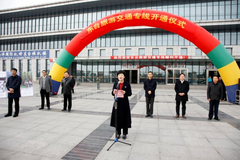 圖2為東臺市副市長孫春燕宣布旅游交通專線正式開通