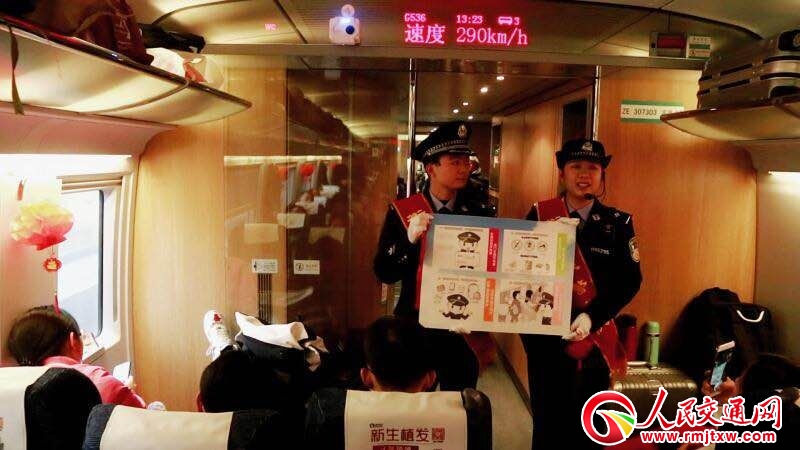 春運(yùn)首日當(dāng)天,衡鐵公安處乘警支隊(duì)的青年民警們踏上了桂林至長沙南的高鐵列車。給大家送上美好的新年祝福之后,青年民警們便利用自己制作小展板講解春運(yùn)安全小知識(shí),推廣微信報(bào)警平臺(tái)和衡陽鐵警青年公眾號(hào)。青年民警熱情洋溢的給旅客群眾分享安全出行小知識(shí),讓整個(gè)車廂熱鬧起來;(dòng)環(huán)節(jié),民警們采取有獎(jiǎng)問答的方式吸引了眾多乘客的參與。一問一答之間,春運(yùn)安全小知識(shí)和常見警情及防范技巧便被旅客們記在了心里。同時(shí),借著春運(yùn)首日宣傳活動(dòng),青年沖鋒隊(duì)還邀請(qǐng)了本趟列車的乘警——衡陽鐵路公安處乘警支隊(duì)歐廣偉警長給旅客們分享了列車常見警情和防范措施,乘客們紛紛點(diǎn)贊。