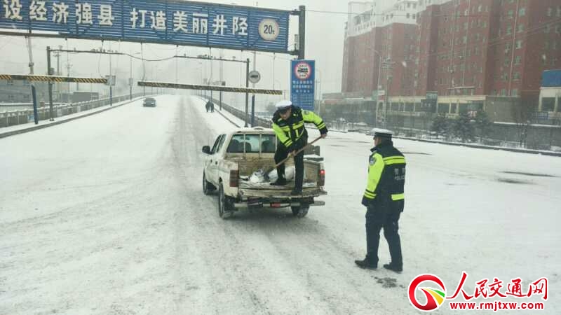 人民交通河北訊(記者常玉坤 通訊員李忠勇)正值春運返程高峰,2月12日至14日,河北省石家莊等地普降大雪,給人員車輛出行帶來不便和安全隱患。井陘縣公安交警大隊啟動了惡劣天氣應急管理預案,全警上路,全力疏導交通,為群眾排憂解難,保障了道路安全暢通。