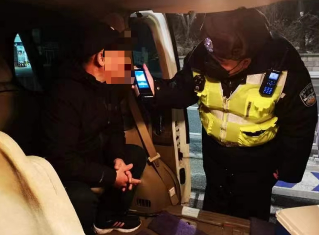 2月3日凌晨00:01,正在大海陽路國盛石化門前路口執(zhí)行夜間酒醉駕違法行為查糾工作的民警,看到一輛由北向南開過來的小型轎車,在進(jìn)入路口時有明顯的遲疑行為,似乎完全沒有預(yù)料到這么冷的天氣,都凌晨了還有交警在查車,立馬驚慌失措。