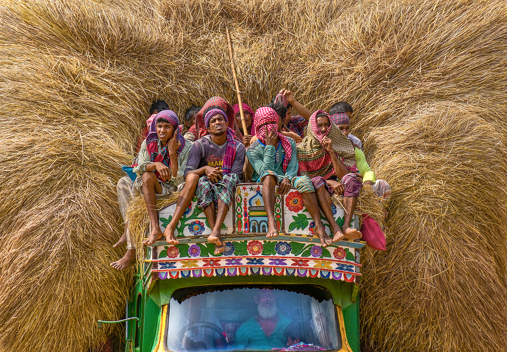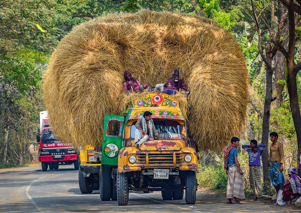 2021年5月11日訊(具體拍攝時間不詳),孟加拉Bogura,卡車向市場行進時,可以看到后面裝載了如山高的稻草。這些稻草之前被曬干,然后進行出售。牲畜飼養(yǎng)者會購買這些稻草,用來當(dāng)做飼料。但是,這樣運輸大捆貨物是十分危險的,經(jīng)常會看到事故發(fā)生。