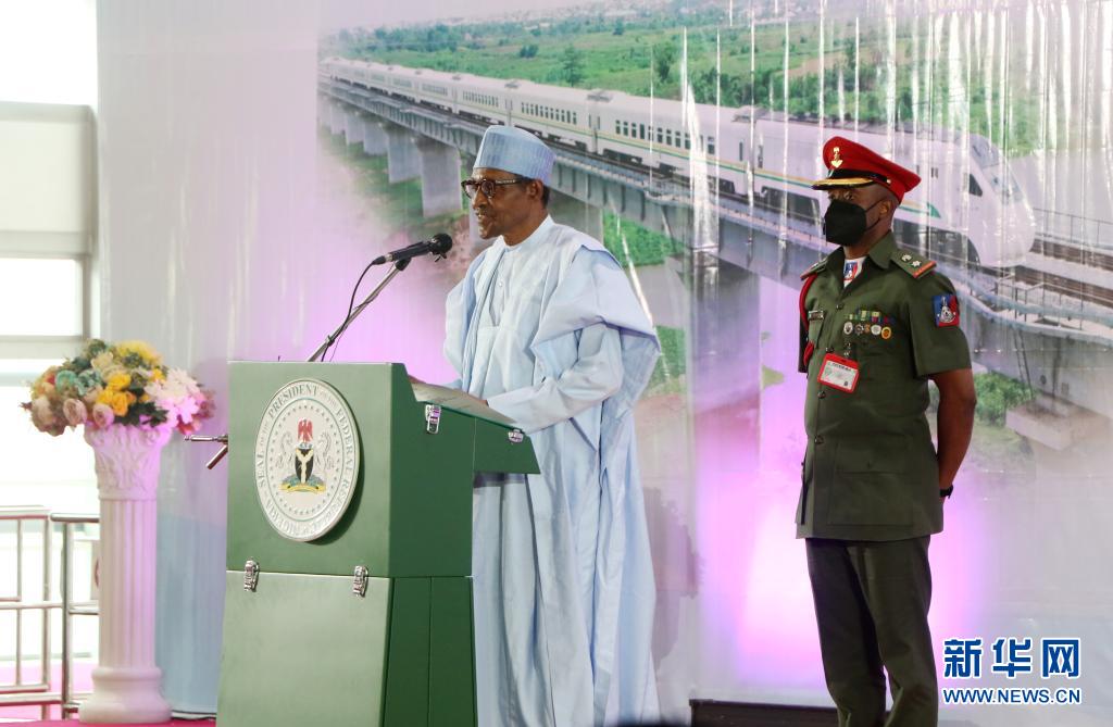 6月10日,尼日利亞總統(tǒng)布哈里在拉各斯的莫博拉吉·約翰遜火車站出席拉伊鐵路通車儀式并講話。