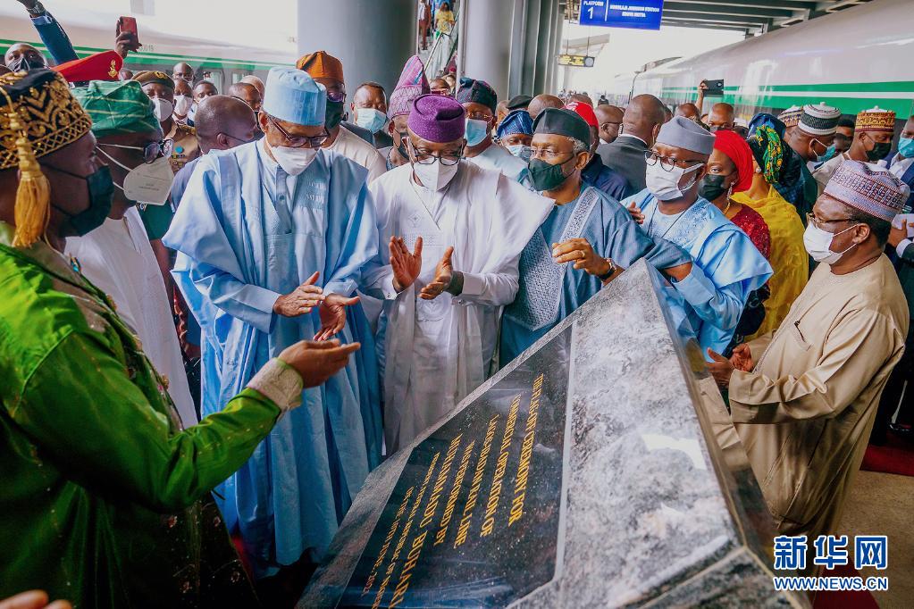 6月10日,尼日利亞總統(tǒng)布哈里(前排左三)在拉各斯的莫博拉吉·約翰遜火車站出席拉伊鐵路通車儀式并揭牌。