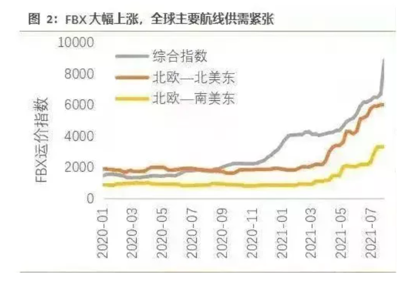 天風(fēng)證券研究所“金海交運(yùn)研究”指出,上海出口集裝箱運(yùn)價指數(shù)(SCFI)和波羅的海貨柜運(yùn)價指數(shù)(FBX)都顯示,全球集裝箱海運(yùn)主干航線運(yùn)價持續(xù)上漲,說明全球集運(yùn)供需關(guān)系緊張。