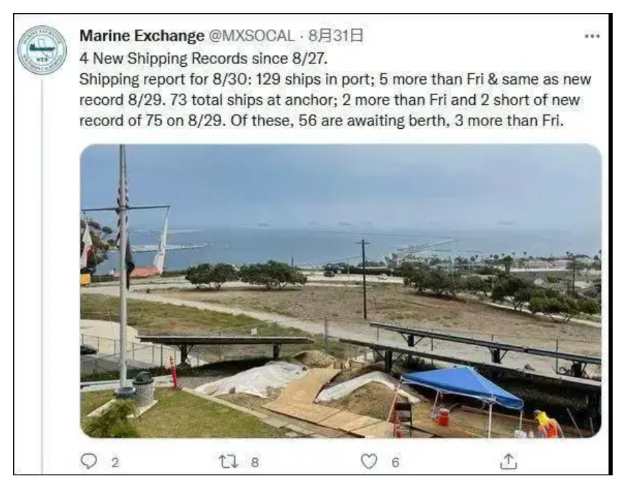 位于加利福尼亞州的洛杉磯港和長灘港是美國面向中國及東亞貿(mào)易線的重要港口,根據(jù)南加州海事交易所發(fā)布的信息,8月末等待泊位的船只數(shù)突破了50艘,刷新了該地的歷史記錄。