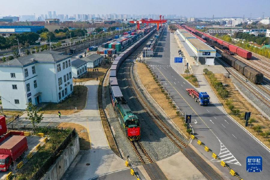 12月8日,“江蘇號”中老鐵路國際貨運(yùn)列車從中國鐵路上海局集團(tuán)有限公司南京貨運(yùn)中心堯化門鐵路貨場發(fā)車(無人機(jī)照片)。新華社記者 李博 攝