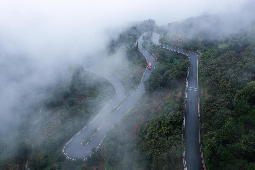 8月17日,公交車從海拔800米的浙江諸暨市趙家鎮(zhèn)桃?guī)X村前往山下的鎮(zhèn)區(qū)(無人機照片)。新華社記者徐昱 攝