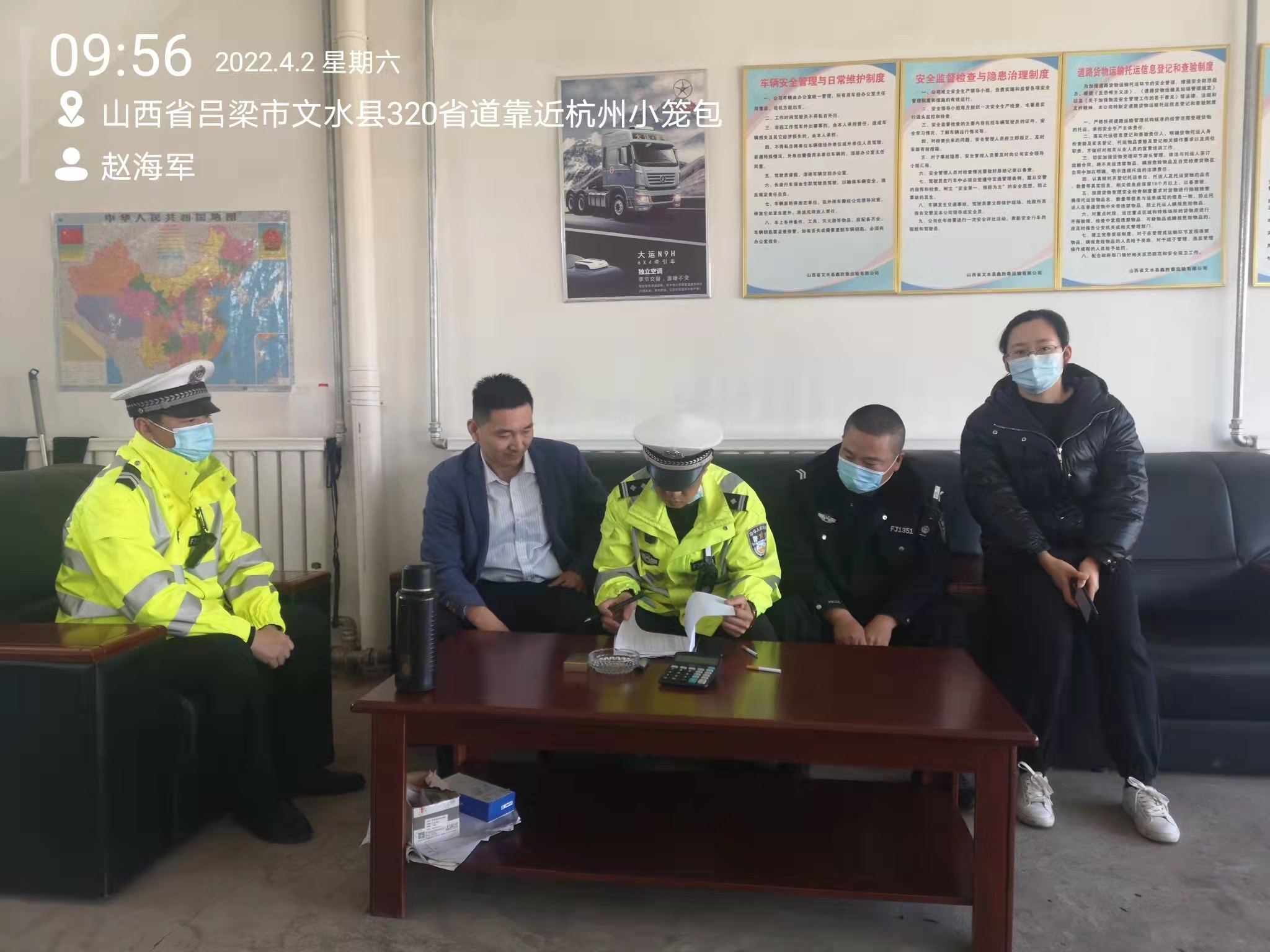 清明期間文水交警深入運(yùn)輸企業(yè)開展交通安全宣傳,為該運(yùn)輸企業(yè)負(fù)責(zé)人、駕駛?cè)饲庙戭A(yù)防重特大道路交通事故的警鐘,全力維護(hù)道路交通安全形勢平穩(wěn)。