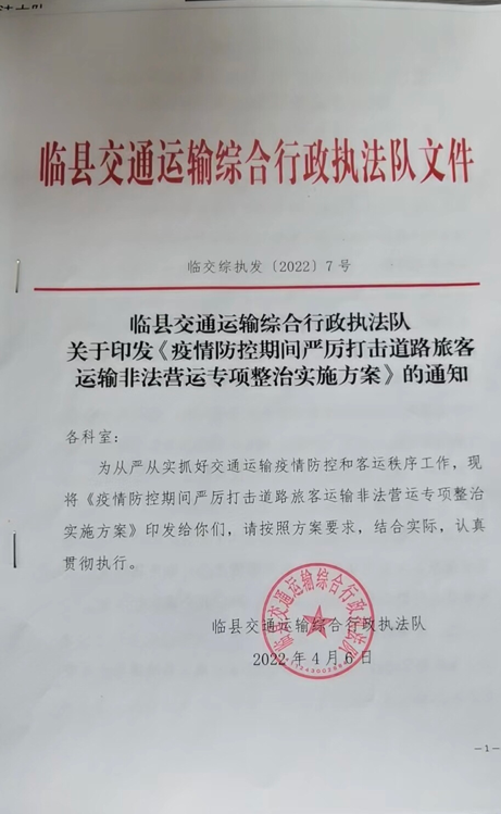 近日,山西省新冠疫情呈現(xiàn)多點(diǎn)發(fā)生態(tài)勢(shì),根據(jù)臨縣疫情防控領(lǐng)導(dǎo)小組要求縣所轄省際、市際、縣際班車全部停運(yùn),為預(yù)防非法旅客運(yùn)輸經(jīng)營行為的發(fā)生,從嚴(yán)從實(shí)抓好交通運(yùn)輸疫情防控和客運(yùn)秩序工作,臨縣交通運(yùn)輸局綜合行政執(zhí)法隊(duì)于4月6日下發(fā)了《疫情防控期間嚴(yán)厲打擊非法從事道路旅客運(yùn)輸專項(xiàng)整治行動(dòng)實(shí)施方案》的通知。
