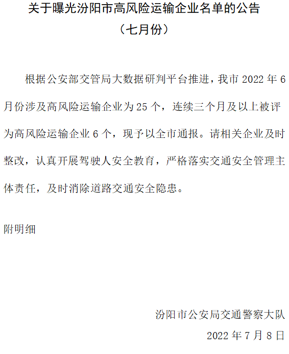 今年以來,汾陽交警大隊車管所積極做好高風(fēng)險運輸企業(yè)隱患管控工作,多舉措清除源頭隱患。7月份,汾陽市高風(fēng)險企業(yè)25家,中風(fēng)險企業(yè)29家,較6月份高風(fēng)險企業(yè)降低4家,中風(fēng)險企業(yè)降低1家。