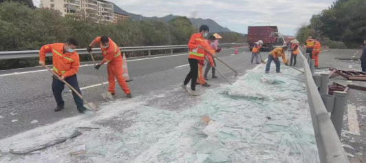 由于散落的玻璃量大、覆蓋面積廣,養(yǎng)護(hù)人員奮力清理,直至15時(shí)20分左右,終于將路面上的玻璃塊、碎片徹底清除,道路恢復(fù)暢通。