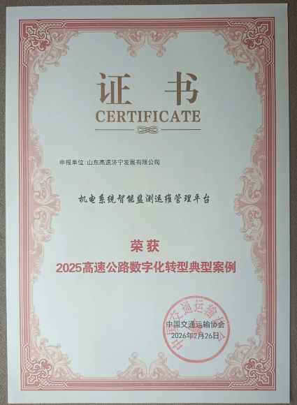 近日,山東高速濟(jì)寧公司自主研發(fā)的“機(jī)電系統(tǒng)智能監(jiān)測(cè)運(yùn)維管理平臺(tái)”獲評(píng)中國(guó)交通運(yùn)輸協(xié)會(huì)第三屆高速公路綠色智慧發(fā)展大會(huì)“2025高速公路數(shù)字化轉(zhuǎn)型典型案例”,標(biāo)志著公司在運(yùn)營(yíng)管理智能化升級(jí)和綠色智慧高速發(fā)展方面取得實(shí)質(zhì)性進(jìn)展。
