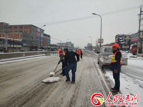 該分局及時下達(dá)清雪除冰命令,一方面加強(qiáng)值班值守,隨時掌握路面通阻信息,一方面由分局領(lǐng)導(dǎo)帶隊組織機(jī)關(guān)科室人員及四個中心道班養(yǎng)護(hù)力量、搶險突擊隊等,出 動1臺平地機(jī),1臺裝載機(jī),4臺路政巡查及養(yǎng)護(hù)車,開始清除積雪,拋灑融雪劑。搶險突擊隊對重要路段、潁城進(jìn)出口路段、穿集鎮(zhèn)路段、平交路口、上下坡段、 橋面及其他險段進(jìn)行清雪,平地機(jī)、裝載機(jī)負(fù)責(zé)干線公路路面清雪。路政人員加強(qiáng)巡查,及時通報公路通行情況,發(fā)現(xiàn)積雪打滑路段,立即報告并配合清理積雪。分 局領(lǐng)導(dǎo)現(xiàn)場調(diào)度,保障了清雪除冰工作順利進(jìn)行。