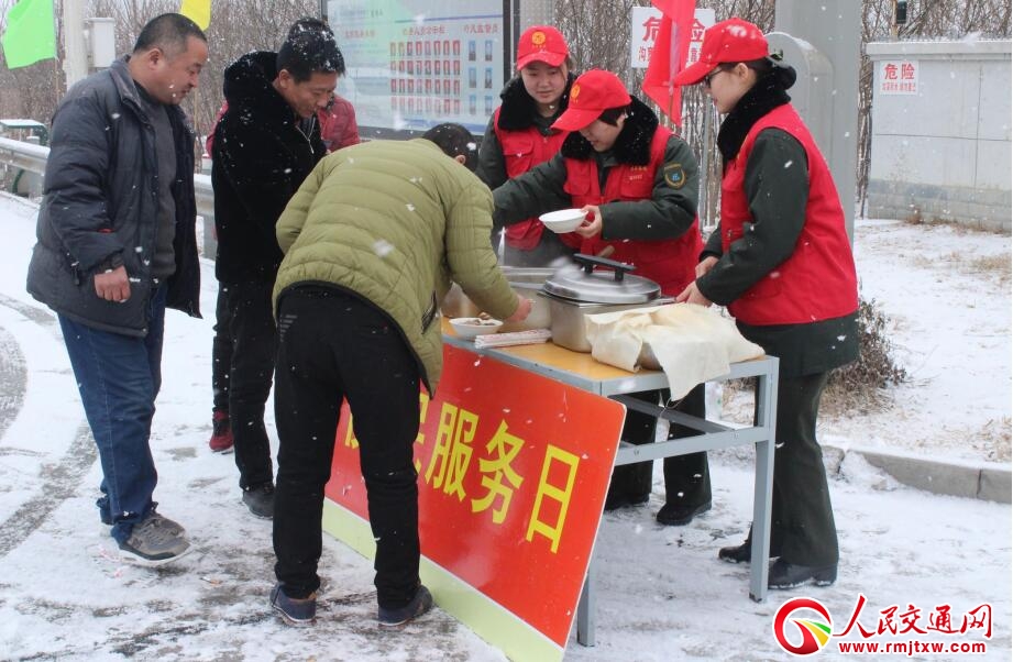 9時15分,站領(lǐng)導(dǎo)帶領(lǐng)辦公室人員,端著熱氣騰騰的大鍋菜、小米粥、饅頭、花卷、糖包、開水,來到收費廣場,為滯留廣場的司乘人員送去了可口豐盛的早餐。司乘人員馬上匯聚過來,連聲感謝,看到大家端起一份份熱飯吃的那么開心,我們心里暖暖的,每一句來自司乘人員發(fā)自肺腑的“謝謝”都讓我們感到無比的欣慰。雖然天上飄著雪花,但是濃濃的親情融化了司乘人員焦躁的心情。司乘人員拿起手機(jī),有的用快手、有的用抖音,拍下感人的場面,紛紛發(fā)往各自的朋友圈,為我們的真誠服務(wù)點贊。