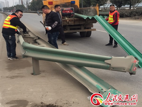 30分鐘后,維修人員趕到現(xiàn)場,只見被撞變形護欄橫在路面上,占據(jù)路面,十分影響交通通行,安全隱患大。維修人員不敢怠慢,迅速在現(xiàn)場設(shè)置好安全與施工作業(yè)標 志牌,便立即投入到緊張的維修工作中。經(jīng)過近50分鐘的維修,共更換護欄板2塊,立柱1根,端頭1個,順利完成維修任務(wù),護欄恢復(fù)了原貌,確保了公路安全通暢。