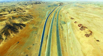 京新高速公路(G7,北京至烏魯木齊)將于6月30日前建成通車,最后的臨河-白疙瘩段各施工單位正抓緊檢查各路段配套設(shè)施。圖為俯瞰穿越戈壁的京新高速公路額濟納旗段。新華社發(fā)