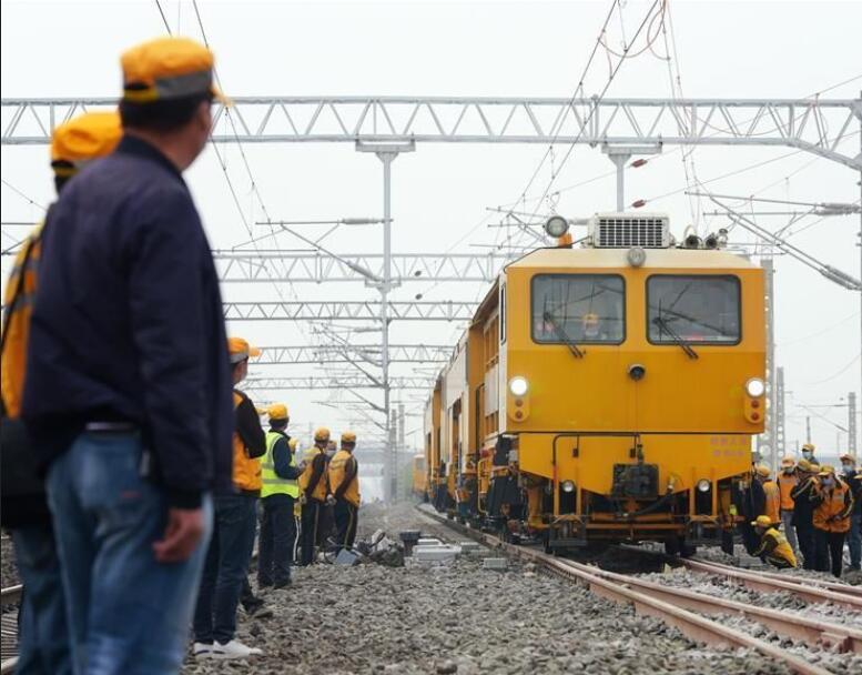 3月22日,工人在銀西高鐵陜西段茂陵站首次轉(zhuǎn)線換裝施工現(xiàn)場(chǎng)作業(yè)。