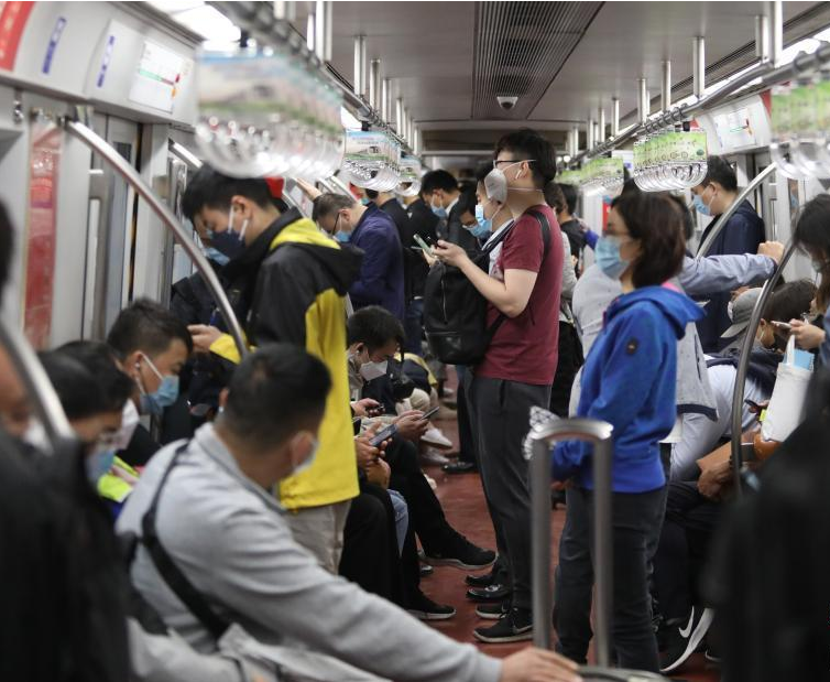 5月18日,市民乘坐北京地鐵1號線出行。當日起,北京進一步調(diào)整公共交通滿載率控制指標。其中,地面公交由75%上調(diào)至90%,軌道交通由65%上調(diào)至80%。