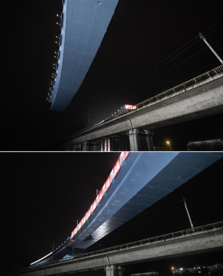 7月16日,寧波軌道交通4號(hào)線上跨杭深、蕭甬鐵路轉(zhuǎn)體橋作業(yè)過(guò)程的前后對(duì)比圖,橋梁順利跨過(guò)鐵路線,實(shí)現(xiàn)精準(zhǔn)對(duì)接(拼版照片)。 當(dāng)日凌晨,經(jīng)過(guò)1個(gè)多小時(shí)的“天窗點(diǎn)”作業(yè),由中鐵四局承建的寧波軌道交通4號(hào)線上跨杭深、蕭甬鐵路轉(zhuǎn)體橋順時(shí)針轉(zhuǎn)動(dòng)40度,實(shí)現(xiàn)精準(zhǔn)對(duì)接。轉(zhuǎn)體成功后,項(xiàng)目將進(jìn)入軌道板、接觸網(wǎng)等附屬施工階段。 據(jù)了解,該轉(zhuǎn)體橋梁總長(zhǎng)301米,寬11米,重約15000噸。
