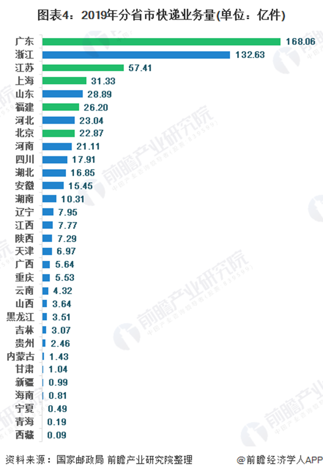 從各省市快遞業(yè)務量來看,2019年快遞業(yè)務量前三省市分別為:廣東(168.06億件)、浙江(132.63億件)、江蘇(57.41億件)。